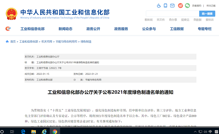 2022年1月21日工信部節(jié)能司正式發(fā)布2021年度國家級綠色工廠名單,河冶科技股份有限公司作為河北省入選單位榜上有名,成為2021年度662家國家級綠色工廠之一。