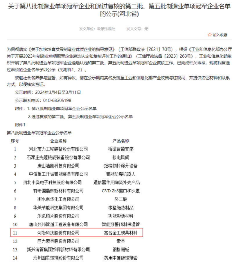 根據(jù)《工業(yè)和信息化部辦公廳關(guān)于開展2023年制造業(yè)單項冠軍企業(yè)遴選認定和復核評價工作的通知》(工信廳政法函〔2023〕263號),工業(yè)和信息化部組織開展了第八批制造業(yè)單項冠軍企業(yè)遴選認定和第二批、第五批制造業(yè)單項冠軍企業(yè)復核工作,已完成相關(guān)審核,河冶科技股份有限公司被認定為第八批制造業(yè)單項冠軍企業(yè)。